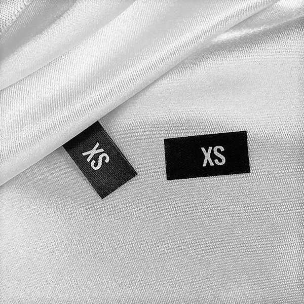Étiquette de taille pour vêtements imprimée sur satin fin, découpée aux ultrasons selon les dimensions présentées.