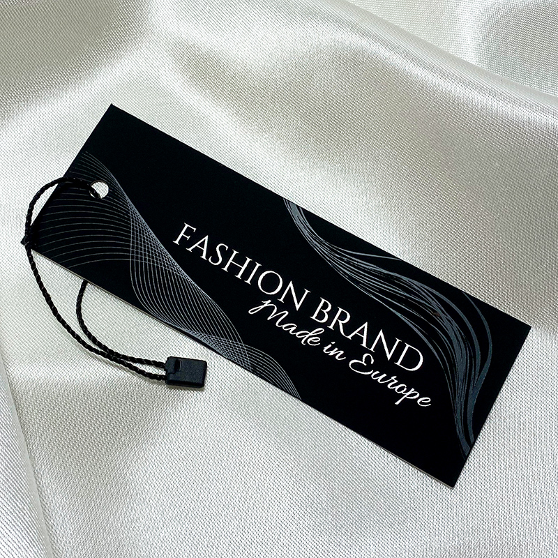 Étiquette de vêtements, en carton plastifié avec feuille Soft Touch et personnalisée numériquement avec folio d'argent.