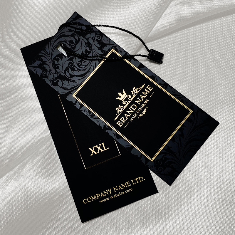 Étiquettes pour vêtements avec un design Premium et sceau avec un cordon noir inclus, fabriquées en carton laminé Soft Touch et écriture personnalisée avec feuille d'or. Ce type d'étiquette est fabriquée en matériaux de haute qualité, utilisant les technologies les plus avancées dans le domaine de l'impression Digitale et finissage.