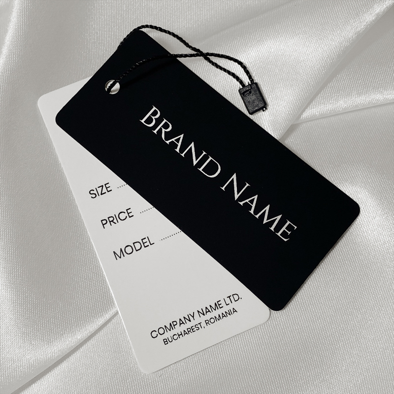 Etiquette en carton personnalisée HT-M112 destinée aux produits textiles, comme les vêtements pour femmes, hommes et divers accessoires d'habillement.