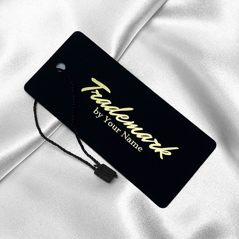 Étiquette de vêtements style tag, réalisée selon les preferences en carton noir avec texte ou logo personnalisés, imprimés par transfert thermique avec feuillet d'or. Ce type d'étiquette est fabriquée en matériaux de haute qualité, utilisant les technologies les plus avancées dans le domaine de l'impression Digitale et finissage.