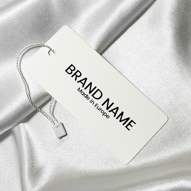 Etiquette personnalisée pour vêtements avec cordon blanc fabriquée sur commande en carton épais, imprimée avec le texte ou le logo de la marque. Ce type d'étiquette est fabriquée en matériaux de haute qualité, utilisant les technologies les plus avancées dans le domaine de l'impression Digitale et finissage.