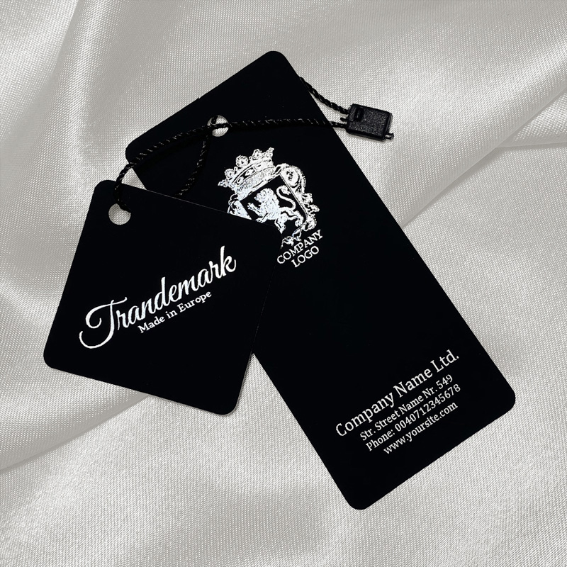 Ensemble composé de 2 superbes étiquettes en carton avec cordon de serrage et sceu pour attacher aux vêtements, en carton laminé Soft Touch noir et personnalisé avec folio argenté de type Digital Hot Stamp. Ce type d'étiquette est fabriquée en matériaux de haute qualité, utilisant les technologies les plus avancées dans le domaine de l'impression Digitale et finissage.