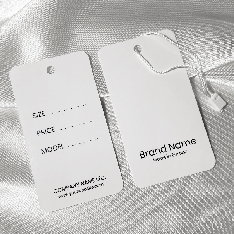 Étiquette pour vêtements en carton épais laminé avec feuille brillante et personnalisé avant/arrière avec le nom ou le logo de la Marque, muni d'un sceau avec corde pour accrocher sur divers articles d'habillement. Ce type d'étiquette est fabriquée en matériaux de haute qualité, utilisant les technologies les plus avancées dans le domaine de l'impression Digitale et finissage.