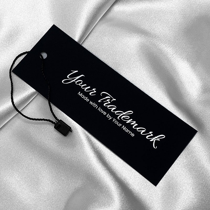 Étiquette pour vêtements à sceau inclus, en carton plastifié avec feuille Soft Touch et personnalisé numériquement avec folio argenté.