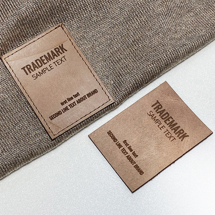 Etiquette en cuir naturel personnalisée, gravée au laser et découpée selon les dimensions indiquées.