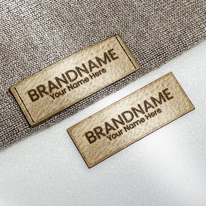 Etiquette en cuir naturel personnalisée, gravée au laser et découpée selon les dimensions indiquées.