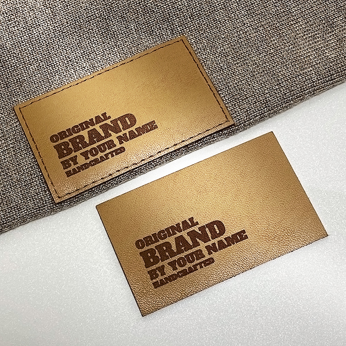 Etiquette en cuir naturel personnalisée, gravée au laser et découpée selon les dimensions indiquées.