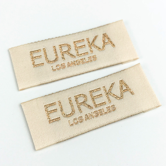 Étiquette de vêtements en damassé, tissée avec du fil à broder ou du fil de lurex modèle WL-M10, personnalisée avec le nom de la Marque ou le logo. Ce modèle d'étiquette textile est fabriqué en matériaux de haute qualité, utilisant les technologies les plus avancées dans le domaine de la broderie Digitale au niveau industriel.