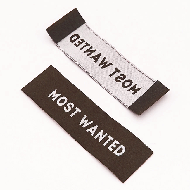 Étiquette tissée adaptée à divers vêtements ou autres textiles, en damassé, avec des bords pliés. Ce modèle d'étiquette textile est fabriqué en matériaux de haute qualité, utilisant les technologies les plus avancées dans le domaine de la broderie Digitale au niveau industriel.