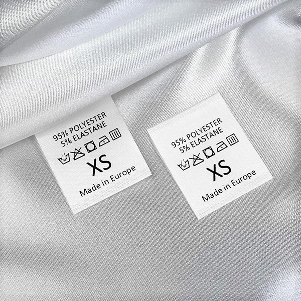 Étiquette de composition imprimée sur satin blanc avec symboles de lavage, composition du matériau et indicateur de taille, avec bords coupés par ultrasons. Ce modèle d'étiquette textile est fabriquée à l'aide des technologies les plus avancées dans le domaine de l'impression numérique sur un support textile. Les étiquettes sont imprimées sur un satin spécial par le procédé de transfert thermique, avec une qualité d'impression impressionnante et une grande résistance au lavage.