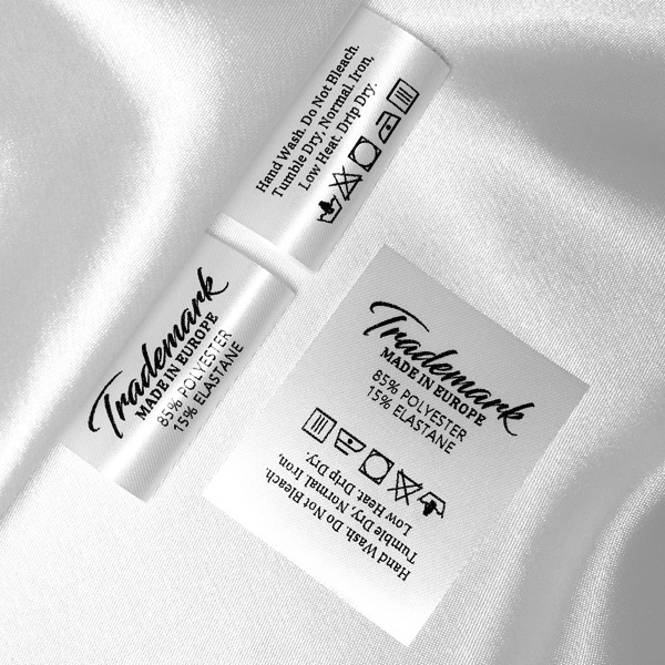 Étiquette de composition personnalisée avec le nom de la Marque, données d'entretien et de lavage, adaptée aux vêtements et accessoires vestimentaires. Ce modèle d'étiquette textile est fabriquée à l'aide des technologies les plus avancées dans le domaine de l'impression numérique sur un support textile. Les étiquettes sont imprimées sur un satin spécial par le procédé de transfert thermique, avec une qualité d'impression impressionnante et une grande résistance au lavage.
