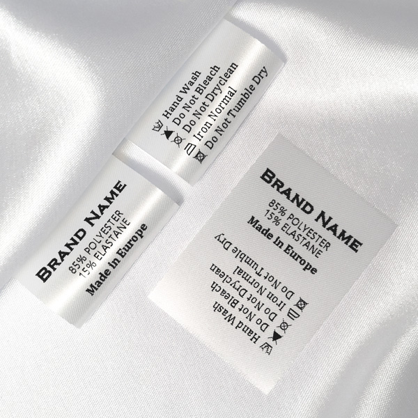 Étiquette de composition personnalisée avec des instructions de lavage et d'entretien, adaptée à différents vêtements. Ce modèle d'étiquette textile est fabriquée à l'aide des technologies les plus avancées dans le domaine de l'impression numérique sur un support textile. Les étiquettes sont imprimées sur un satin spécial par le procédé de transfert thermique, avec une qualité d'impression impressionnante et une grande résistance au lavage.