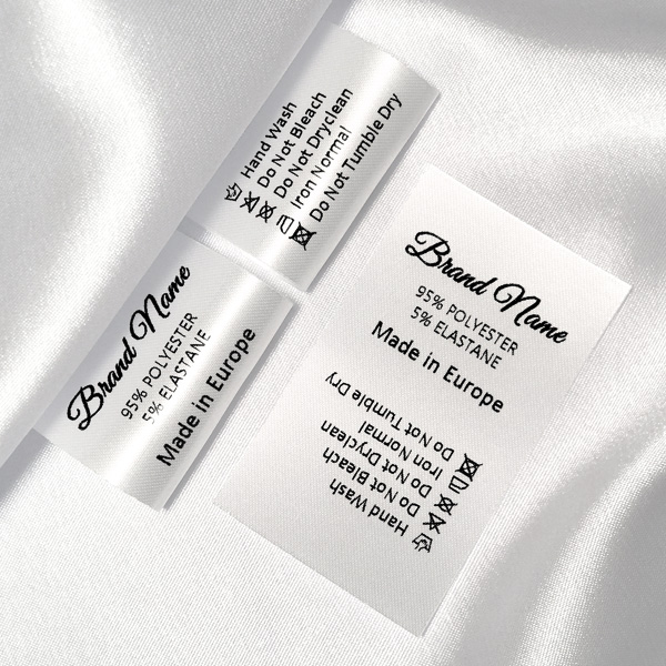 Étiquette de composition réalisée en fin satin blanc personnalisée avec le nom de la Marque et les textes de lavage et d'entretien. Ce modèle d'étiquette textile est fabriquée à l'aide des technologies les plus avancées dans le domaine de l'impression numérique sur un support textile. Les étiquettes sont imprimées sur un satin spécial par le procédé de transfert thermique, avec une qualité d'impression impressionnante et une grande résistance au lavage.