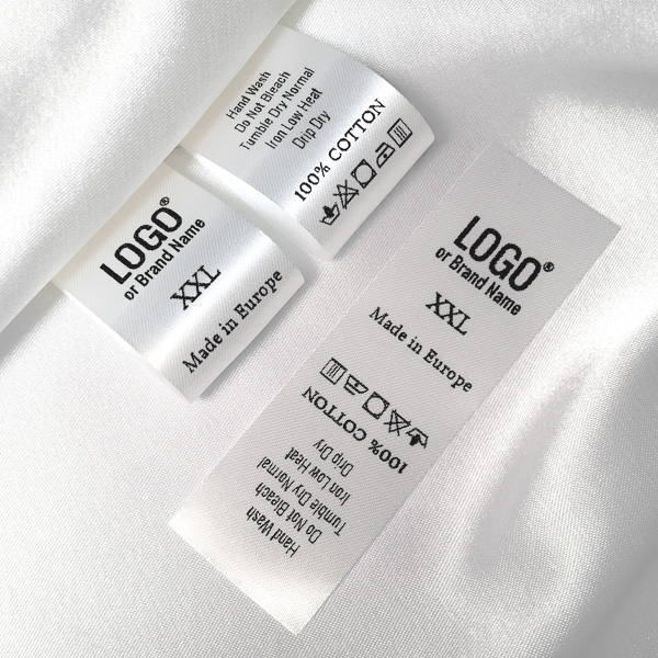 Étiquette de vêtements imprimée sur satin fin avec indicateur de taille et données d'entretien et de lavage, adaptée à divers vêtements et produits textiles. Ce modèle d'étiquette textile est fabriquée à l'aide des technologies les plus avancées dans le domaine de l'impression numérique sur un support textile. Les étiquettes sont imprimées sur un satin spécial par le procédé de transfert thermique, avec une qualité d'impression impressionnante et une grande résistance au lavage.