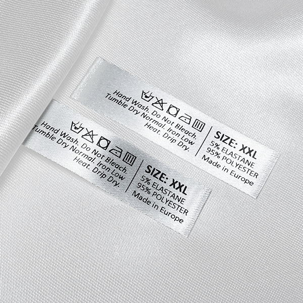 Étiquette personnalisée en satin pour étiqueter les vêtements avec des informations d'entretien et de maintenance, y compris les symboles de lavage, la composition et les tailles. Ce modèle d'étiquette textile est fabriquée à l'aide des technologies les plus avancées dans le domaine de l'impression numérique sur un support textile. Les étiquettes sont imprimées sur un satin spécial par le procédé de transfert thermique, avec une qualité d'impression impressionnante et une grande résistance au lavage.