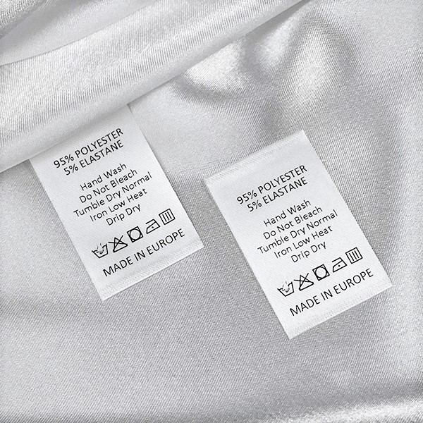 Étiquette de composition, avec symboles d'entretien et de lavage, personnalisée avec le nom de la marque et la composition du matériau, imprimée sur un fin satin blanc. Ce modèle d'étiquette textile est fabriquée à l'aide des technologies les plus avancées dans le domaine de l'impression numérique sur un support textile. Les étiquettes sont imprimées sur un satin spécial par le procédé de transfert thermique, avec une qualité d'impression impressionnante et une grande résistance au lavage.