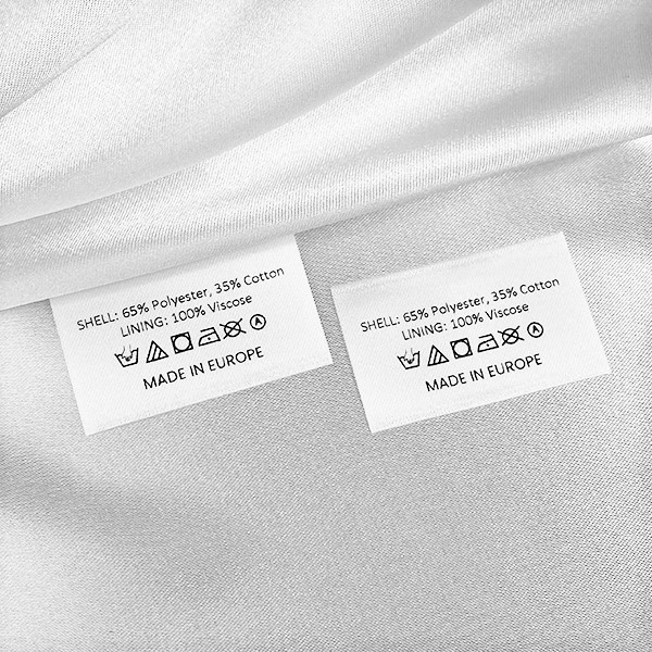 Étiquette avec symboles de lavage et d'entretien, et des informations sur la composition du matériau, personnalisée sur un satin fin de haute qualité, découpé à chaud par ultrasons. Ce modèle d'étiquette textile est fabriquée à l'aide des technologies les plus avancées dans le domaine de l'impression numérique sur un support textile. Les étiquettes sont imprimées sur un satin spécial par le procédé de transfert thermique, avec une qualité d'impression impressionnante et une grande résistance au lavage.