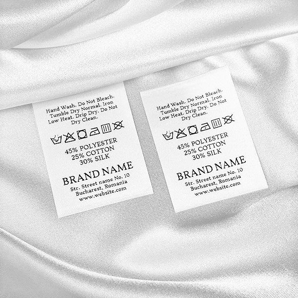 Étiquette de composition en fin satin blanc, personnalisée avec le nom et le logo du fabricant, les symboles de lavage et le type de matériau utilisé pour produire l'article auquel il sera cousue. Ce modèle d'étiquette textile est fabriquée à l'aide des technologies les plus avancées dans le domaine de l'impression numérique sur un support textile. Les étiquettes sont imprimées sur un satin spécial par le procédé de transfert thermique, avec une qualité d'impression impressionnante et une grande résistance au lavage.