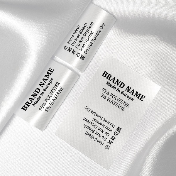 Étiquette lavage des textiles en satin blanc fin, imprimée avec des textes personnalisés en noir, adapté à divers vêtements. Ce modèle d'étiquette textile est fabriquée à l'aide des technologies les plus avancées dans le domaine de l'impression numérique sur un support textile. Les étiquettes sont imprimées sur un satin spécial par le procédé de transfert thermique, avec une qualité d'impression impressionnante et une grande résistance au lavage.