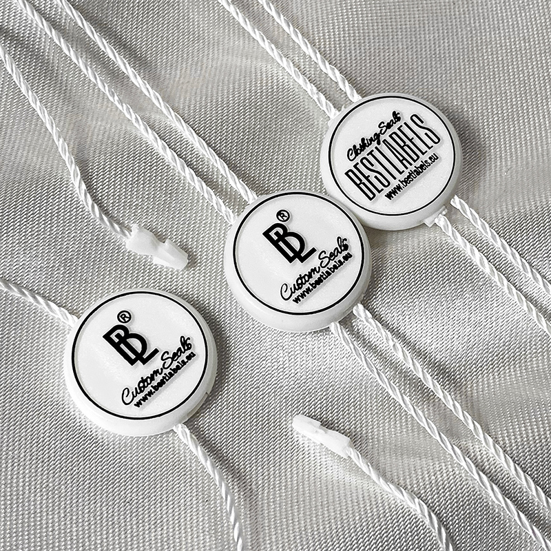 Scellé en plastique ST-M91 en forme ronde, très élégant et magnifiquement personnalisé sur deux côtés avec le nom ou l'emblème de la Marque, adapté aux vêtements, chaussures, sacs, etc. Ce modèle de scellé est fabriqué en matériaux de haute qualité, utilisant les technologies les plus avancées de ce domaine.